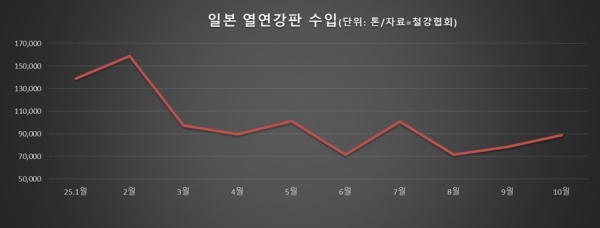 철강협회 수입통계에 따르면 11월 일본산 열연강판 수입량은 10만7,021톤으로 집계됐다. 이는 올해 2월 15만8,883톤 수입 이후 9개월 만에 가장 높은 수치다. 일본산 수입은 8~10월 동안 유지됐던 7만~9만 톤대 구간에서 벗어나며, 수입 흐름이 다시 회복되는 분위기라는 평가가 나온다.