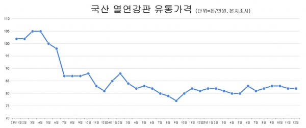 철강업계에 따르면 국산 열연강판 유통가격은 12월 톤당 80만 원 초반선에서 등락 없이 유지되고 있다. 반덤핑 잠정관세 적용 이후 중국·일본산 물량이 크게 줄었지만, 유통시장은 가격 상승 흐름보다 수요 부진이 뚜렷한 상황이다. 유통시장을 중심으로 재고가 쌓여 있고, 연말 특유의 매입 축소 기조까지 겹치며 거래가 눈에 띄게 둔화했다는 설명이다.