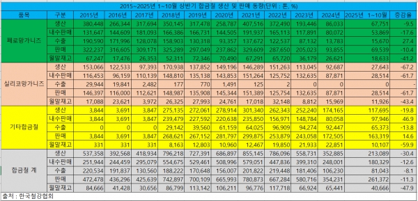 한국철강협회 데이터에 따르면 올해 1~10월 합금철 생산 및 판매는 각 21만3,089톤, 26만1,372톤으로 전년 동기 대비 30.4%, 11.3% 감소했고, 내수와 수출은 각 18만329톤, 8만1,043톤으로 전년 동기 대비 12.6%, 8.1% 줄었다.