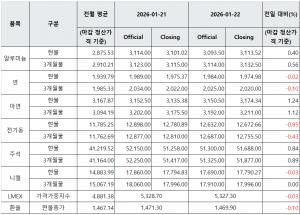 [표] LME 비철금속 및 환율 동향(1월 22일)