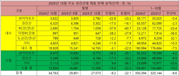 2025년 1~10월 경강선재 판매 전년比 8.6% 감소
