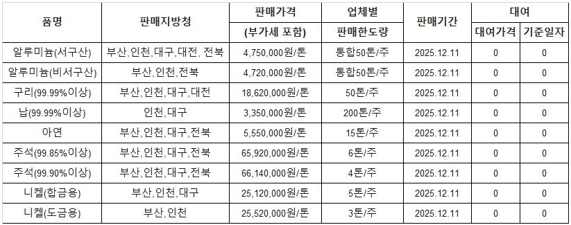 [표] 조달청 방출 가격(12월 11일)