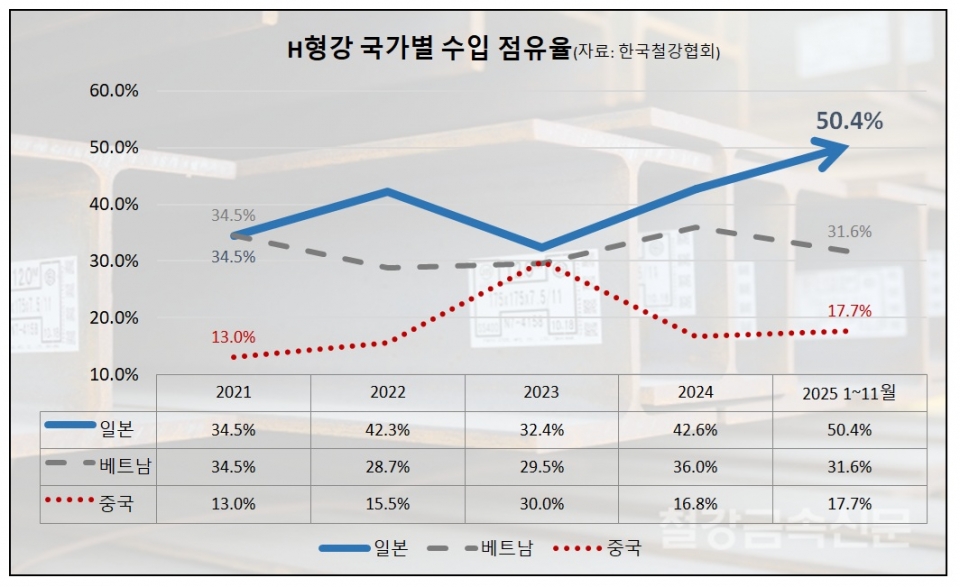 한국철강협회 자료에 따르면 중국산 H형강 수입 점유율은 2023년을 제외하고 5개년 평균 10%대를 유지하고 있는 반면 일본산 점유율은 평균 40%대로 급등한 상황이다. 특히 올해 일본산 H형강 수입 점유율은 50%대까지 돌파했다.