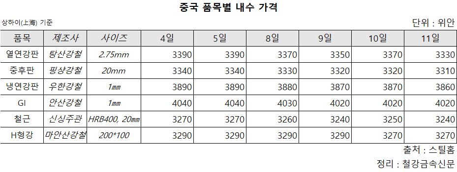 11일(현지시각) 스틸홈 일일 중국 철강 가격 통계에 따르면, 완제품 품목 6종 가격은 모두 일주일 전보다 하락했다. 열연강판 가격이 전주대비 톤당 60위안 하락하며 품목 중 낙폭이 가장 컸고, 중후판, 냉연강판, 철근 가격은 각각 30위안 떨어지며 그 뒤를 이었다. 용융아연도금강판과 H형강은 톤당 20위안씩 가격이 하락했다.