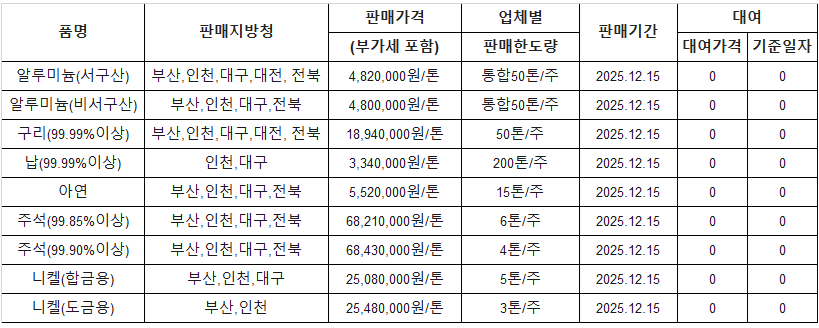 - ■ [표] 조달청 방출 가격(12월 11일)