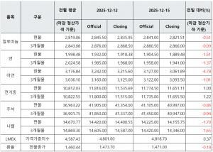 [표] LME 비철금속 및 환율 동향(12월 15일)