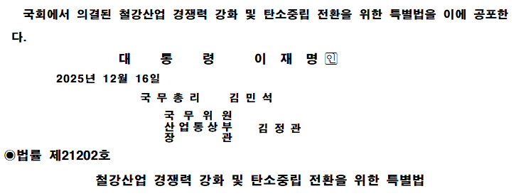 16일, 정부는 국무회의에서 의결된 ‘철강산업 경쟁력 강화 및 탄소중립 전환을 위한 특별법’을 공포한다고 밝혔다. 국무회의 의결은 지난주에 이뤄진 것으로 알려졌다.