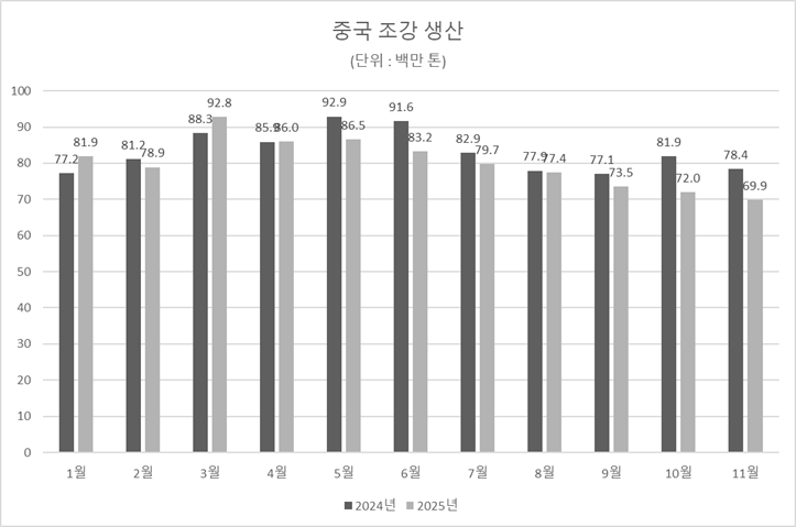 15일(현지시각) 중국 국가통계국(NBS) 발표에 따르면, 11월 중국의 조강 생산은 6,987만 톤으로 지난해 같은 달과 비교해 10.9% 감소하며, 7개월 연속 2024년 대비 낮은 수준을 나타냈다. 특히 월간 기준으로 올해 처음으로 7천만 톤을 밑돌았다. 선철과 완제품 생산도 각각 6,234만, 1억1,591만 톤으로 전년동월대비 8.7%, 2.6% 감소했다.