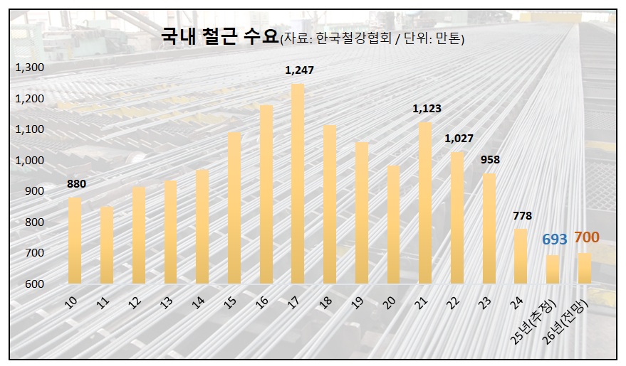 코로나19 기저효과에 2022년까지 1천만톤을 넘겼던 국내 철근 수요는 연이은 건설경기 침체로 2023년 900만톤 중반대로 꺾이더니 2024년 700만톤 후반대에 이어 지난해 600만톤 후반대까지 수직낙하했다.