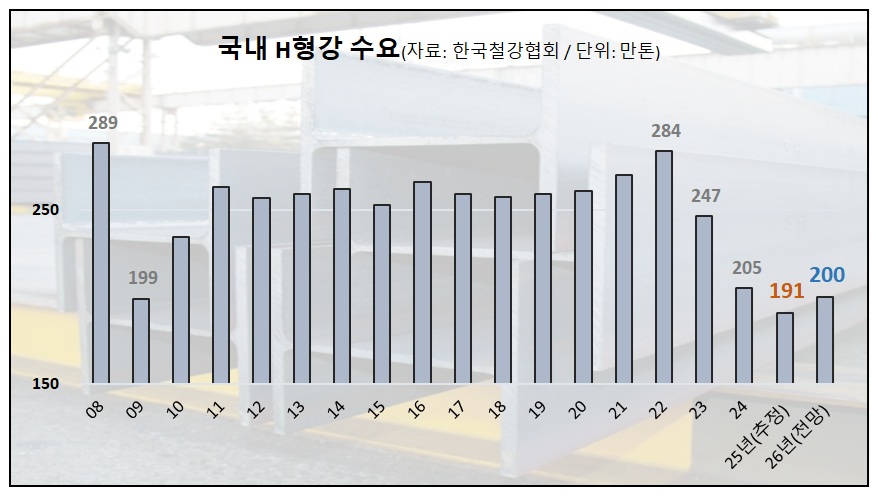월평균 수요가 15만9,000톤임을 감안하면 지난해 국내 H형강 총수요는 191만톤으로 추산된다. 2024년 H형강 총수요(205만톤)과 비교하면 7.1%(14만톤) 줄어들 전망이다. 최근 고점이었던 2022년(284만톤)과 비교하면 무려 32.9%(93만톤) 급감하는 셈이다.