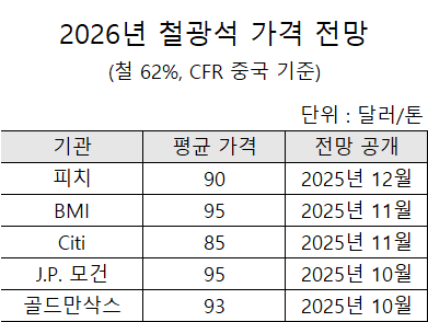 글로벌 투자은행, 신용평가사 등 주요 기관들의 예측도 철광석 가격이 내년 100달러를 밑돌 것이라는 전망으로 수렴하고 있다. 글로벌 신용 평가사 피치(Fitch Ratings)는 이달 4일 내년 철광석 평균 가격 전망치를 톤당 90달러로 제시했고, 글로벌 산업·원자재 리서치 기관 BMI도 11월, 내년 철광석 가격을 평균 95달러로 예측했다.