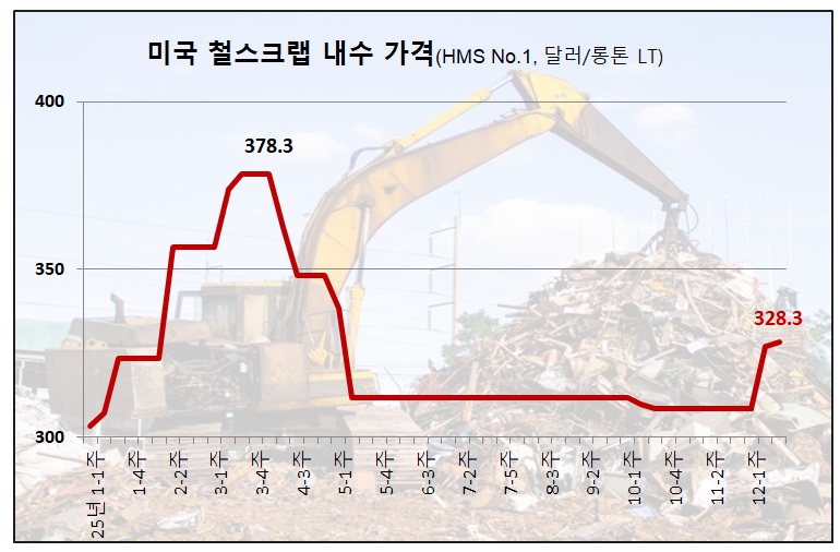 12월 셋째 주 미국 HMS No.1 등급 철스크랩 컴포짓 프라이스는 롱톤(LT)당 328.3달러로 전주 대비 1.3달러 오르며 2주 연속 강세다. 컴포짓 프라이스는 미국 동부 피츠버그, 시카고, 필라델피아에서 거래된 철스크랩 평균 가격이다.