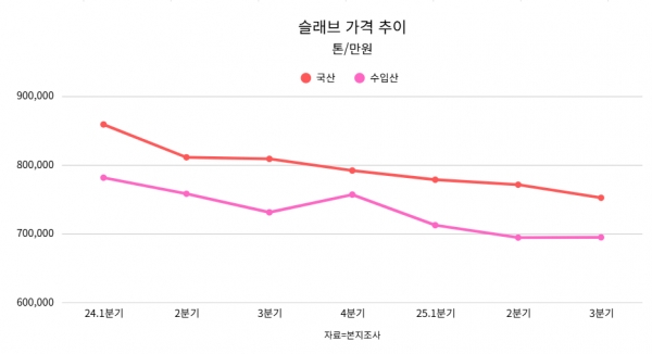 국내 슬래브(Slab) 시장이 급격한 가격 조정을 마무리하고 안정 국면에 접어들었다. 2024년 초 80만 원대 중반까지 올랐던 국산 슬래브 가격은 단계적인 조정을 거쳐 2025년 들어 70만 원 중반대에서 형성되고 있으며, 일본산을 중심으로 한 수입 슬래브 가격 역시 60만 원 후반대에서 횡보하는 모습이다.