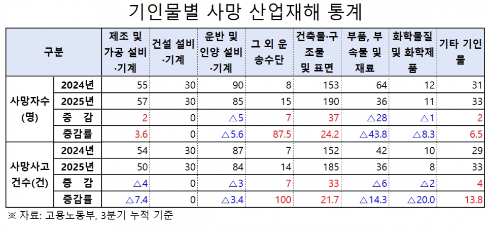 고용노동부의 최신 통계에 따르면 2025년 3분기 누적 재해조사 대상 사고 사망자는 457명(440건)으로 전년 동기 443명(411건) 대비 14명, 3.2% 증가했다. 사망사건 수는 줄었지만, 다수가 사망하는 대형 사고가 발생하면서 인원수에서는 증가세를 보인 것.