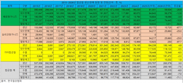 2026년 국내 철강 생산 감소·저가 수입재 증가에 합금철 판매 감소 지속, 생산은 반등 전망2026년 생산 전년比 3.0% 증가, 판매·내수·수출·재고 전년比 7.0%·7.5%·6.0%·71.1% 감소