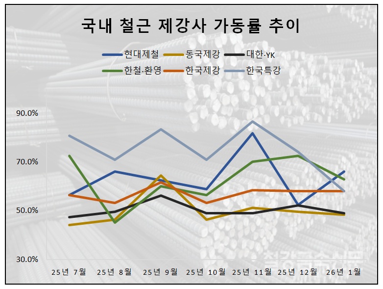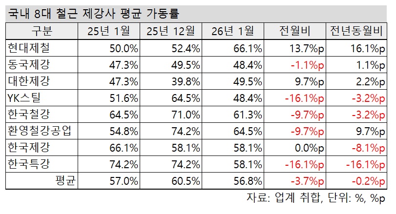 업계에 따르면 △현대제철 △동국제강 △대한제강 △YK스틸 △한국철강 △환영철강공업 △한국제강 △한국특강 등 국내 8대 철근 제강사 1월 평균 가동률은 56.8%로 집계됐다.