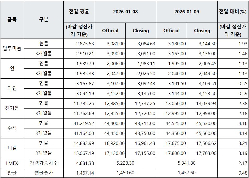 [표] LME 비철금속 및 환율 동향(1월 9일)