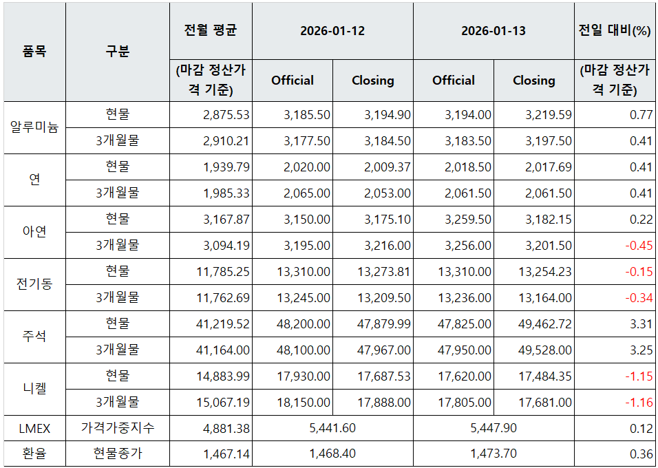 [표] LME 비철금속 및 환율 동향(1월 13일)