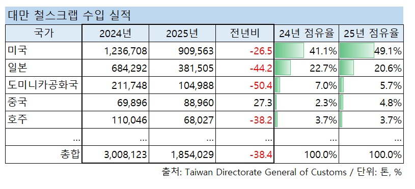 앞서 러시아의 우크라이나 침공 여파 등 2022년 293만톤으로 2년 연속 주춤했던 대만 철스크랩 수입은 2023년 342만톤으로 3년 만에 급증하기도 했으나, 지난해 다시 2년 연속 급감하면서 100만톤 후반대까지 내려앉은 모습이다.