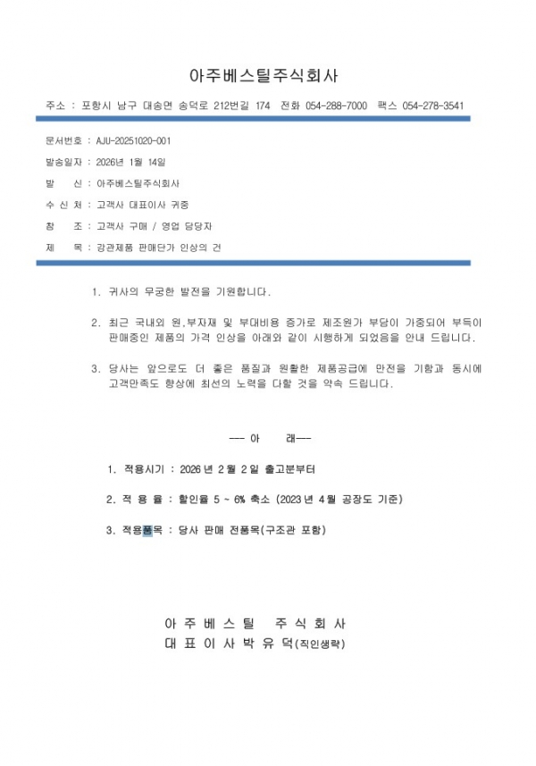 회사측에 따르면 국내외 원부자재 및 부대비용 증가로 제조원가 부담이 가중되어 판매중인 제품의 가격 인상을 시행하게 됐다고 밝혔다. 이에 아주베스틸은 2월 2일 출고분부터 할인율 5~6% 축소해 제품 판매에 나선다.