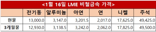 런던금속거래소(LME) 16일(현지시간) 기준 전기동 현물과 3개월물은 각각 톤당 13,000달러와 12,930달러를 기록했으며, 알루미늄은 3,147달러와 3,138.5달러, 아연은 3,201.5달러와 3,242달러로 집계됐다. 연은 2,017달러와 2,062달러, 니켈은 17,625달러와 17,825달러, 주석은 49,425달러와 49,500달러를 나타냈다.
