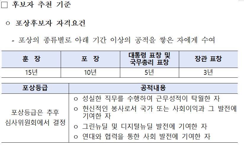 공적은 정부, 학계, 업계, 유관기관 소속 전문가로 구성된 공적심사위원회의 심사를 거쳐 추천될 예정이다. 위원회는 포상 대상자의 자격요건 확인 및 공적내용 사실성 검토하 고포상 대상자의 훈격 및 추천순위를 결정할 계획이다.