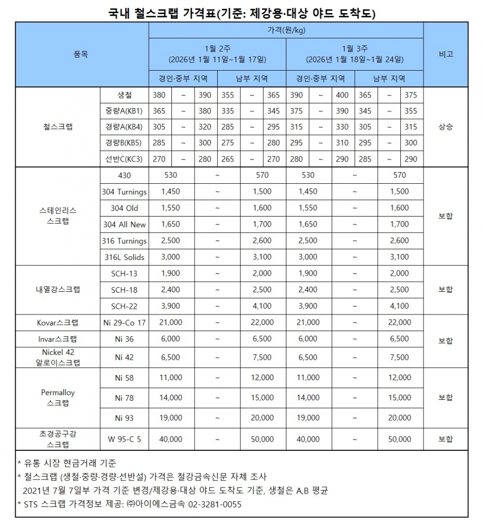 1월 셋째 주 경인·중부권 철스크랩 가격은 지난주 현대제철과 동국제강, 세아베스틸의 추가 단가 인상으로 전 등급에서 톤당 1만원 상승했다.