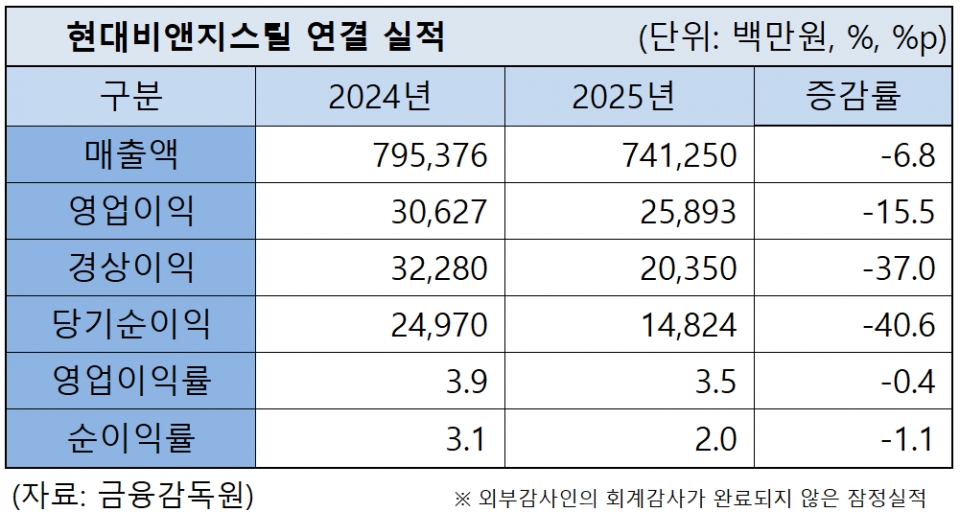 현대비앤지스틸이 2025년 연결기준 잠정 실적을 발표했다. 매출액 7,412억 원, 영업이익 258억 원, 당기순이익 148억 원으로 각각 2024년 대비 6.8%, 15.5%, 40.6% 감소했다.