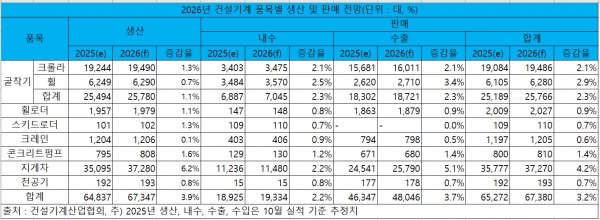 한국건설기계산업협회(회장 문재영, 이하 ‘협회’)가 발표한 ‘2026년 건설기계산업 전망’에 따르면 2025년 10월 말 실적을 기준으로 추정한 2025년 건설기계 완성차의 총 생산과 출하량은 각 6만4,837대 및 6만5,272대로 전년 대비 15.7% 및 16.4% 감소할 것으로 추정된다.
