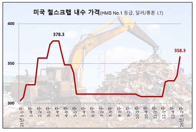 1월 둘째 주 미국 HMS No.1 등급 철스크랩 컴포짓 프라이스는 롱톤(LT)당 358.3달러로 전주 대비 24달러 오르며 2주 연속 상승했다. 컴포짓 프라이스는 미국 동부 피츠버그, 시카고, 필라델피아에서 거래된 철스크랩 평균 가격이다.