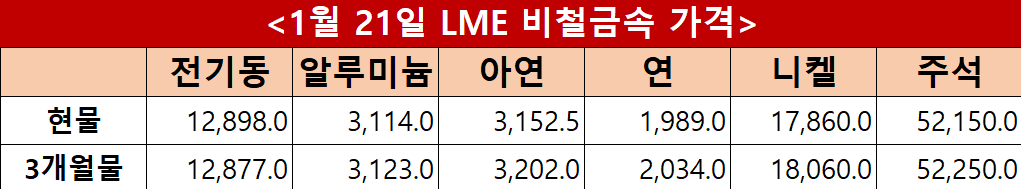 런던금속거래소(LME) 21일(현지시간) 기준 전기동 현물과 3개월물은 각각 톤당 12,898달러와 12,877달러를 기록했으며, 알루미늄은 3,114달러와 3,123달러, 아연은 3,152.5달러와 3,202달러로 집계됐다. 연은 1,989달러와 2,034달러, 니켈은 17,860달러와 18,060달러, 주석은 52,150달러와 52,250달러를 나타냈다.