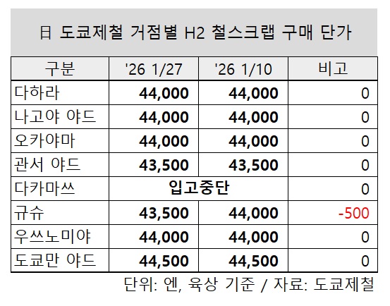 이에 따라 도쿄제철 거점별 철스크랩 가격은 H2 등급 기준 △다하라 4만4,000엔 △나고야 야드 4만4,000엔 △오카야마 4만4,000엔 △관서 야드 4만3,500엔 △다카마쓰(입고중단) △규슈 4만3,500엔(-500엔) △우쓰노미야 4만4,000엔 △도쿄만 야드 4만4,500엔으로 조정됐다.