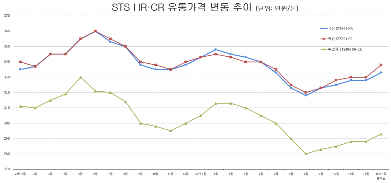 STS 유통업계에 따르면 1월 중하순 중대형 STS 유통점에서 포스코산 STS304 냉연강판 판매 가격은 톤당 335만~340만 원 전후 수준을 형성하고 있다. 지난 연말보다 톤당 5만~10만 원 수준 오른 가격대다.