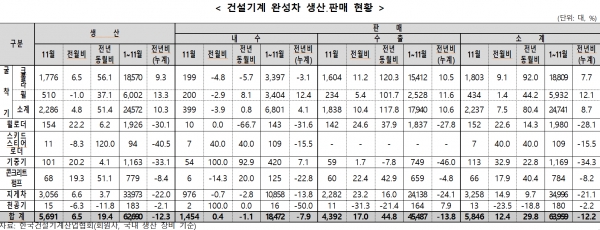 국내 주택시장 장기 침체와 SOC 투자 감소로 인해 내수 부진이 지속됐음에도 기저효과와 주요 수출국들의 경기부양책으로 인해 수출이 큰 폭으로 증가하면서 11월 건설기계 생산 및 판매가 증가했다. 다만 내수 부진이 지속되는 가운데 최대 수출시장인 북미시장의 침체, 아시아 및 중남미, 대양주 지역 건설 및 광산업 경기 둔화 등이 겹치면서 누적 기준 생산 및 판매는 금융위기 이후 최저 수준에 머무르고 있다.