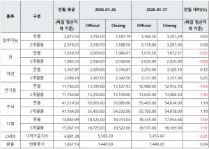 [표] LME 비철금속 및 환율 동향(1월 27일)