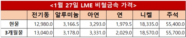 런던금속거래소(LME) 27일(현지시간) 기준 전기동 현물과 3개월물은 각각 톤당 12,980달러와 13,040달러를 기록했으며, 알루미늄은 3,166.5달러와 3,178달러, 아연은 3,293달러와 3,331달러로 집계됐다. 연은 1,979.5달러와 2,029달러, 니켈은 18,335달러와 18,570달러, 주석은 55,400달러와 55,700달러를 나타냈다.