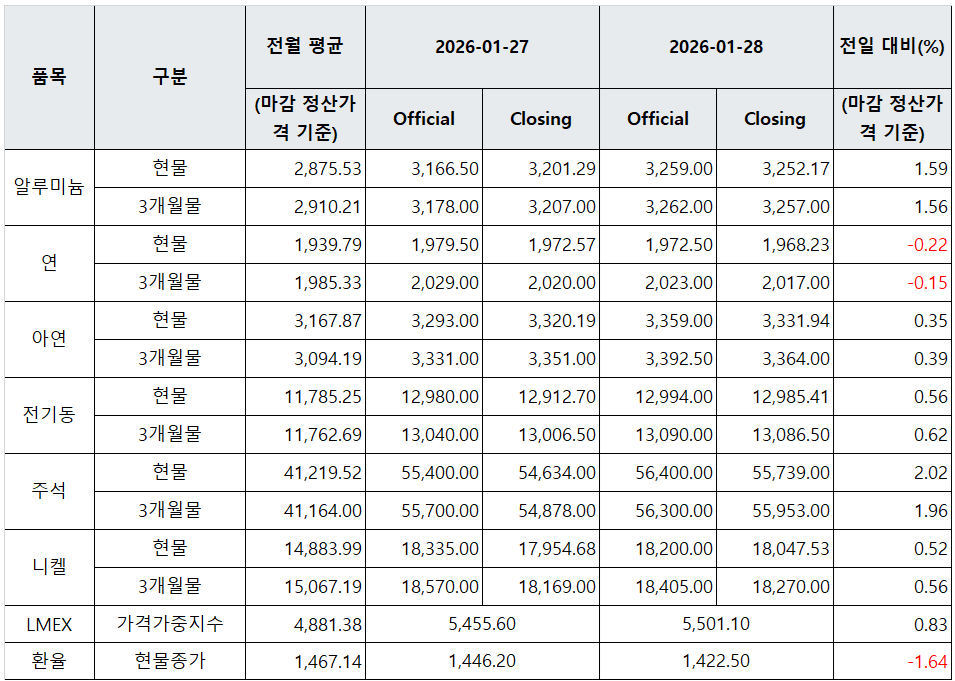 [표] LME 비철금속 및 환율 동향(1월 28일)