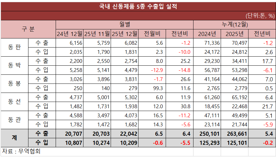 지난해 12월 신동제품 5종 수출은 전년 동월 대비 증가하며 연말에 비교적 견조한 흐름을 유지한 반면, 수입은 감소해 교역 구조가 수출 중심으로 재편되는 모습이 뚜렷했다. 연간 누계 기준으로도 수출 증가세가 이어지며 품목별 실적 차별화가 한층 분명해졌다.
