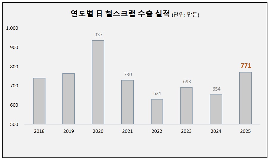 앞서 2019년까지 700만톤대를 유지하던 일본 철스크랩 수출은 2020년 937만톤으로 급증하며 2009년(940만톤)에 이어 역대 두 번째로 높은 수준을 기록한 바 있다.