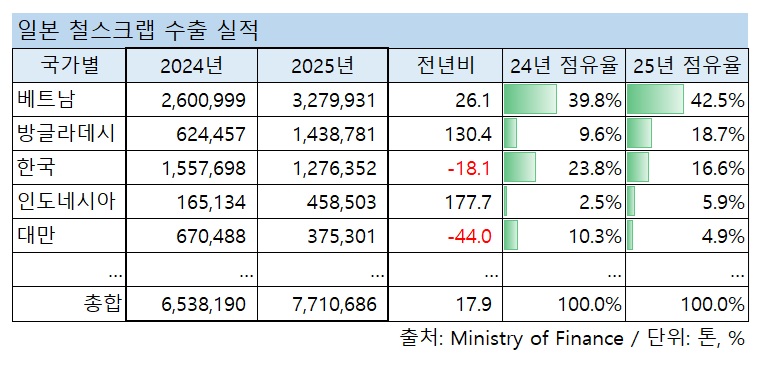 지난해 일본 철스크랩 내수가 위축된 가운데 달러 대비 엔화 약세가 지속되면서 수출 확대로 이어졌다. 특히 베트남과 방글라데시에서 수입 의향이 크게 늘면서 전반 실적을 견인했다.