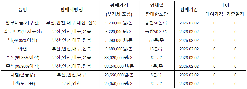 [표] 조달청 방출 가격(2월 2일)