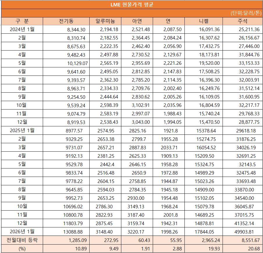 지난달 LME 비철금속 현물가격 평균은 전기동이 톤 당 1만3,088.88달러(+1,285.09달러), 알루미늄 3,148.4달러(+272.95), 아연 3,220.17달러(+60.43), 연 1,998.26달러(+55.95), 니켈 1만7,844.05달러(+2,965.24), 주석 4만9,903.81달러(+8,551.67)를 각각 기록했다. 전월 대비 가격 상승률로는 주석이 20.68%로 가장 높았고, 니켈(+19.93%)과 전기동(+10.89%)이 잇따랐다.