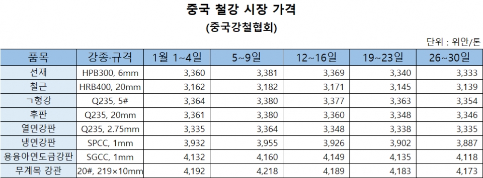 [오늘 중국은] 1월 넷째 주 중국 철강價 약보합