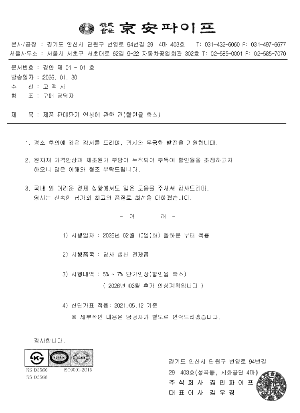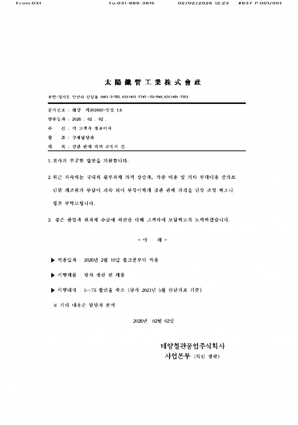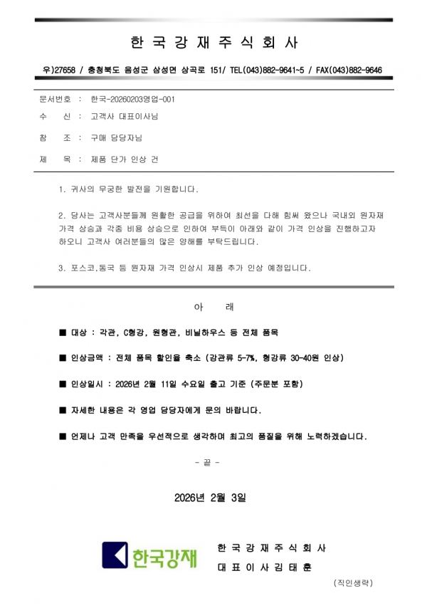 업계에 따르면 유화강관, 한국강재, 경안파이프, 에이스스틸, 태양철관공업까지 다수의 업체들은 2월 가격 인상에 대한 공문을 고객사에 발송했다.