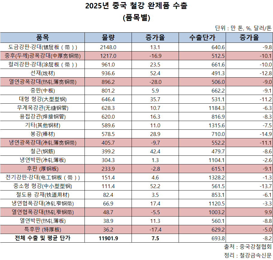 완제품 수출 단가는 열연협폭광대를 제외한 전 품목에서 2024년 대비 하락했다.
