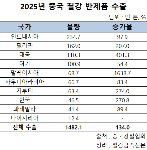 한편, 지난해 반제품 수출은 2배 이상으로 늘어 1,482만 톤을 기록했다. 인도네시아로의 수출이 235만 톤으로 가장 많았고, 필리핀, 태국, 튀르키예로의 수출이 100만 톤 이상을 기록했다.