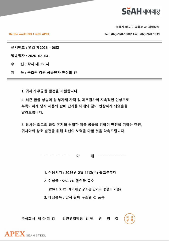 세아제강, 2월 구조관 제품 가격 인상공문 발송