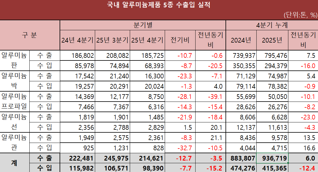 반면 알루미늄관은 수출 9,578톤으로 13.5% 증가했으며 수입도 16.6% 늘어 상대적으로 견조한 흐름을 보였다.