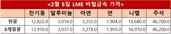 런던금속거래소(LME) 5일(현지시간) 기준 전기동 현물과 3개월물은 각각 톤당 12,822달러와 12,910달러를 기록했으며 알루미늄은 3,014달러와 3,037달러, 아연은 3,255달러와 3,278달러로 집계됐다. 연은 1,904달러와 1,955달러, 니켈은 16,680달러와 16,970달러, 주석은 46,700달러와 46,200달러를 나타냈다.
