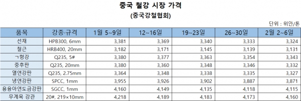 중국 철강 가격이 춘절 연휴(2월 15~23일)가 다가오며 비수기 속 수요가 더욱 위축한 가운데 하락세를 이어갔다.